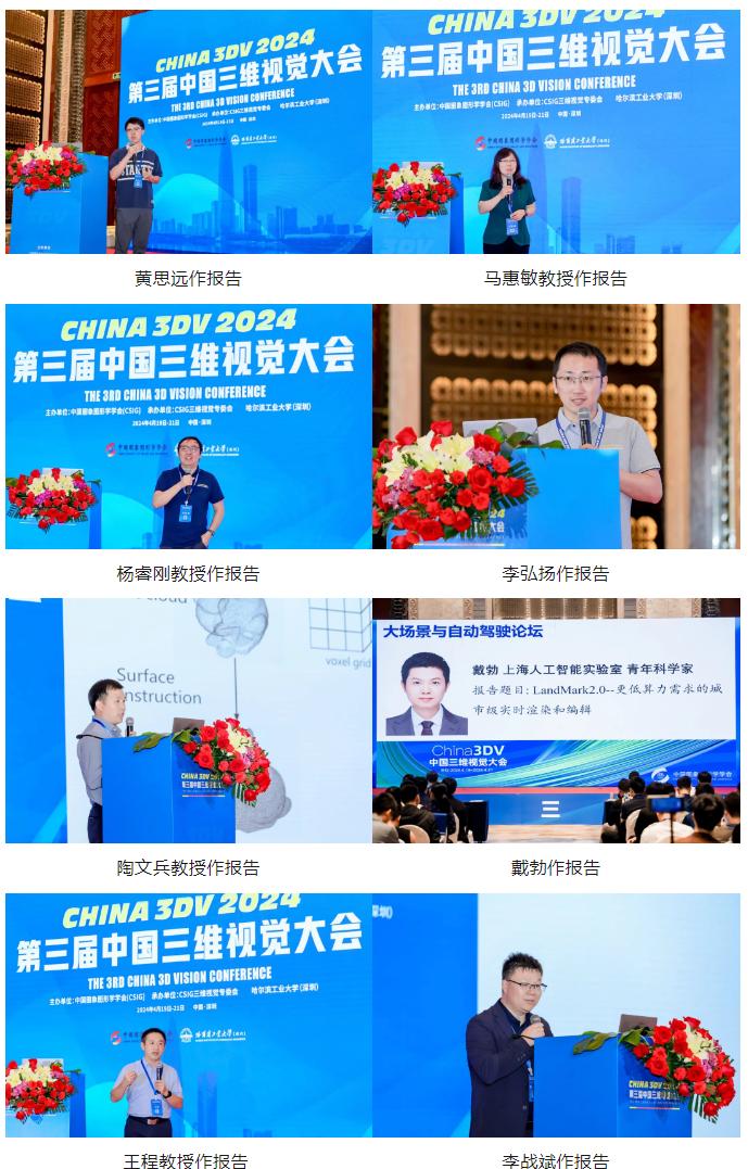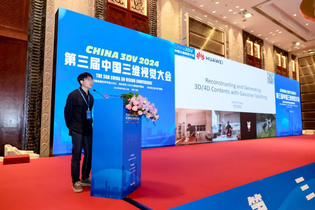 4月19日下午16:40,国防科技大学郭裕兰副教授、北京理工大学武玉伟副教授主持了青年新星论坛。南京大学姚遥副教授、浙江大学廖依伊研究员、浙江大学彭思达研究员、上海交通大学晏轶超助理教授、斯坦福大学博士后徐英豪、新畅元科技首席算法科学家郑泽荣、北京大学陈文拯助理教授、北京大学孙赫助理教授、腾讯AI Lab胡文博研究员、IDEA曾爱玲研究员、之江实验室PI兼浙江大学研究员徐晓刚、北京师范大学张鸿文副教授、国防科技大学施逸飞副教授、香港中文大学(深圳)陈冠英助理教授、中科院计算所杨洁研究员、KAUST张彪研究员、西北工业大学惠乐副教授、OPPO美国研究院高级科学家李众分别作了题为“高真实感多视点三维重建”、“面向自动驾驶的高写实仿真:从重建到生成”、“无需特征检测的图像匹配”、“三维数字人的重建、编辑与驱动”、“Large Gaussian Reconstruction Model for Efficient 3D Reconstruction and Generation”、“基于高斯Splatting的数字化身建模”、“动态场景的表征和成像”、“三维科学成像:从太空到细胞”、“Anti-Aliasing in Neural Rendering”、“大规模三维人物数据搭建及相关生成算法的进展”、“针对真实世界降质数据的高效神经辐射场”、“移动相机下脚地交互合理的单目实时全身运动捕捉”、“几何结构驱动的机器人感知与交互”、“面向文生三维的可泛化法线-深度扩散模型”、“具有复杂拓扑的开曲面重建和生成方法”、“Exploring Representations for 3D Generative Models”、“基于超点表示的三维场景理解方法研究”、“基于时空特征的实时动态高斯Splatting”的报告。