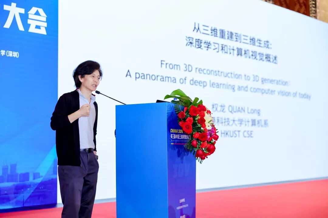 4月21日上午8:30,香港科技大学权龙教授作了题为“From 3D Reconstruction to 3D Generation: a Panorama of Deep Learning and Computer Vision of Today”的主旨报告。在报告中首先重温计算机视觉的确定性几何方法,然后介绍三维、视频和图像视觉的概率和生成方法。最后,从生成未来的角度展开了讨论。