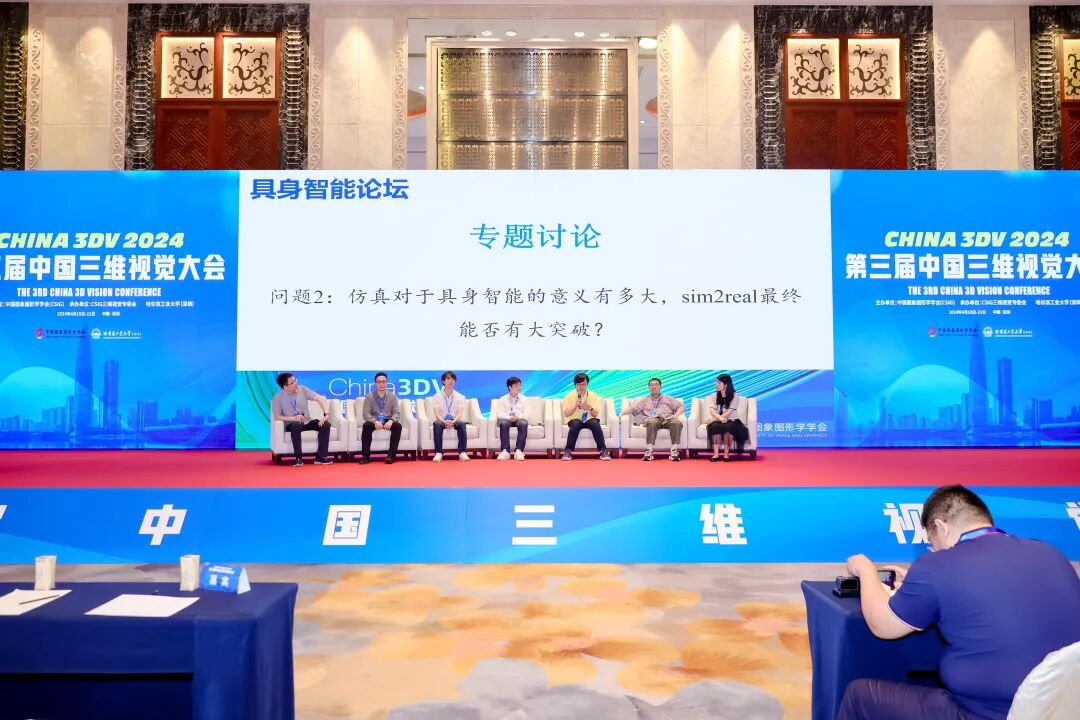 4月20日上午10:20,中国科学技术大学刘利刚教授、肯塔基大学杨睿刚教授主持了3DV与世界战略模型论坛以及Panel讨论,北京大学陈宝权教授、上海科技大学虞晶怡教授、上海AI Lab乔宇教授分别作了题为“从图形计算到4D AIGC到具身智能”、“Emerging Foundation Models for Embodied AI”、“书生多模态大模型:进展与展望”的报告。MSRA研究主管童欣、UCSD苏昊副教授、UT-Austin黄其兴副教授围绕3DV与世界战略模型这个主题,从不同角度展开探讨,碰撞思想,以促进产生一些新的思想,达成研究方向、技术应用上的共识,推动相关领域的研究进展及产学研合作。