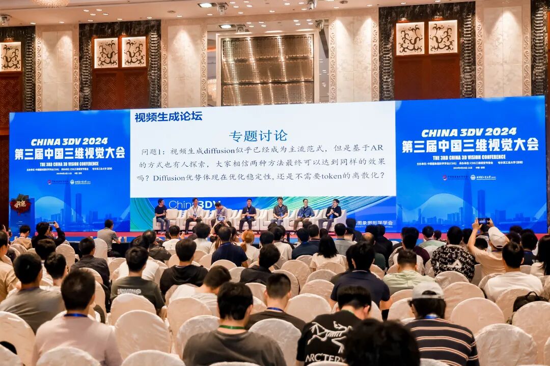 4月19日晚上20:00,香港中文大学韩晓光助理教授、浙江大学彭思达研究员主持了优秀学生论坛。华为方杰民、香港大学龙霄潇、北京大学吴睿海、UC Berkeley王倩倩、南洋理工大学蔡中昂、蒙特利尔大学刘圳、清华大学李哲、香港中文大学徐霖宁分别作了题为“基于Gaussian Splatting的3D/4D内容重建和生成”、“基于跨域生成模型的单目三维重建”、“具身智能中物体操作的视觉表征”、“基于单目视频的运动信息恢复与动态场景重建”、“动作捕捉与动作生成的相遇还有多远?”、“三维表征与非水密网格的重建与生成”、“Animatable Gaussians:基于3D Gaussian Splatting的可驱动数字人体化身”、“Multiverse Reality: 基于神经辐射场技术的高逼真虚拟现实场景”的报告。随后,还展开了主题为“在当前这个'卷'时代,做科研要不要追热点”的非正式辩论赛。